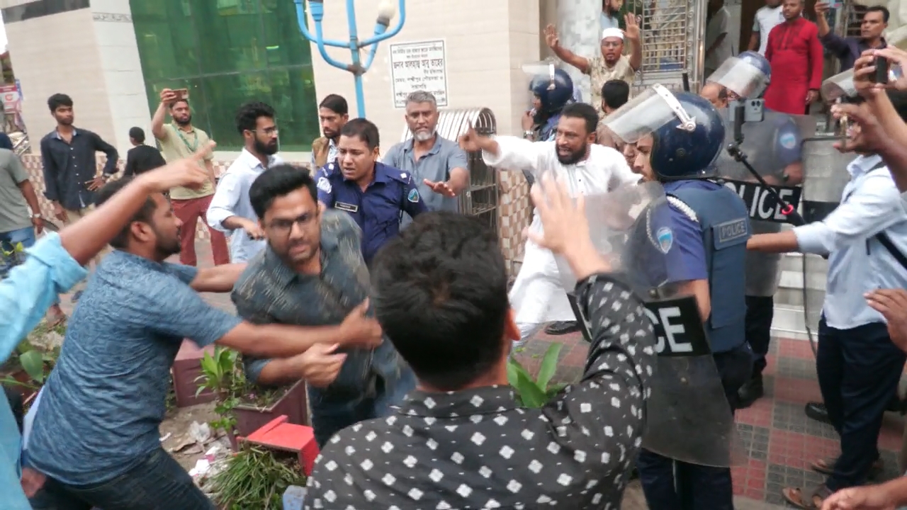এদিকে প্রায় একই সময়ে বৈষম্যবিরোধী ছাত্রদের ‘নৈরাজ্যের’ প্রতিবাদে ‘জুলাই ফাইটার্স’ ব্যানারে মিছিল করেন ছাত্রদলের নেতাকর্মীরা। এ ঘটনার পর শহরের চকবাজারসহ আশপাশ এলাকায় অতিরিক্ত পুলিশ মোতায়েন করা হয়েছে।